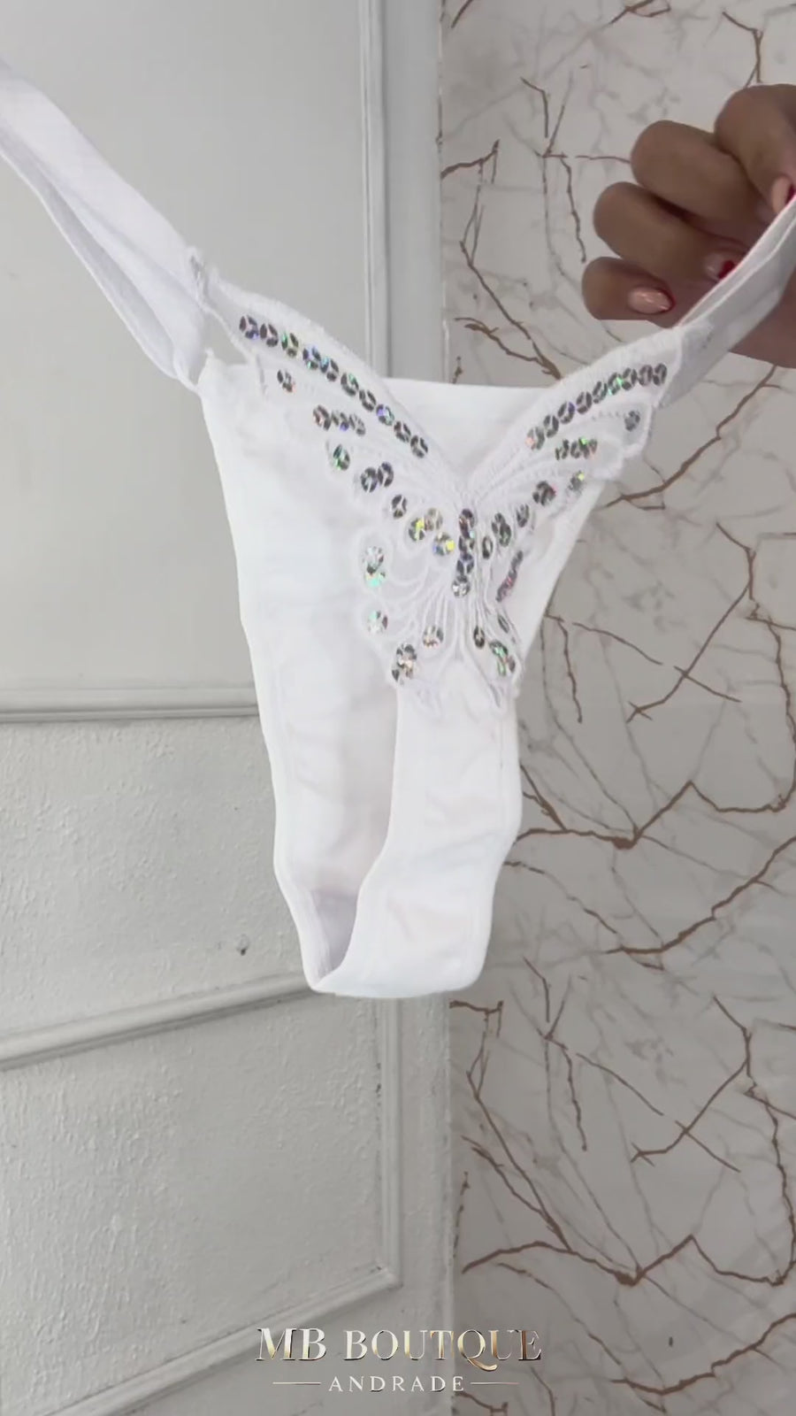 Design: Modelagem fio dental minimalista, com destaque absoluto para a borboleta bordada e iluminada por lantejoulas. Acabamento suave, elegante e extremamente sensual.