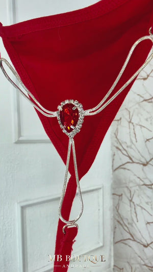 Design: Calcinha fio dental com pedra vermelha lapidada, strass aplicado e correntes metálicas decorativas