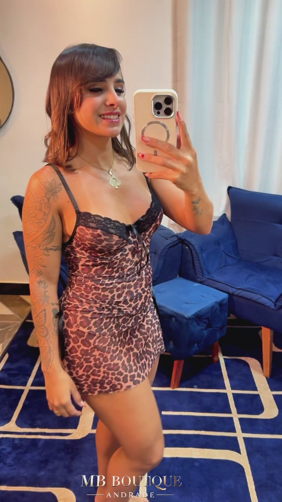 Camisola é a escolha perfeita para quem deseja unir ousadia e delicadeza em um look irresistível. Desenvolvida em tecido leve com estampa animal print, ela traz uma modelagem que valoriza as curvas e cria um visual poderoso para noites especiais.