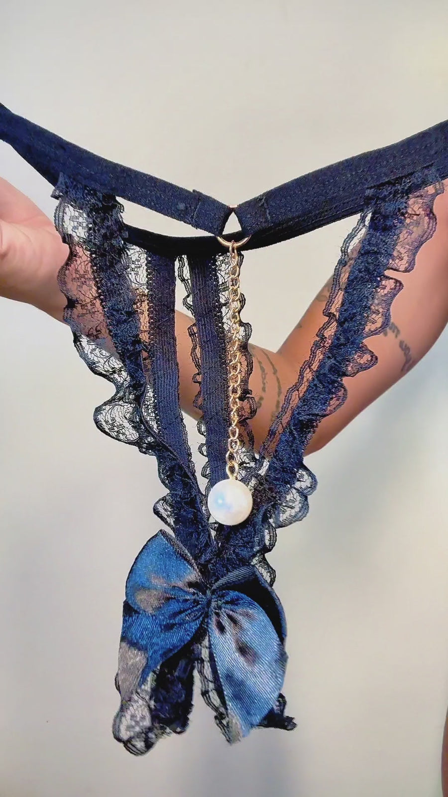 Essa lingerie proporciona uma sensação única de poder, luxo e feminilidade. A delicadeza da renda contrasta com a ousadia da abertura inferior, enquanto a corrente com pérola acrescenta um charme irresistível. Ao vestir essa peça, você se sente mais confiante, sexy e absolutamente desejada.