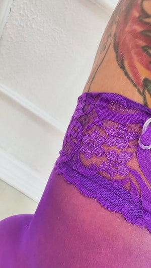 Com espartilho rendado em tom violeta profundo, calcinha fio dental e meias 7/8 com renda delicada, este conjunto transforma o corpo feminino em uma verdadeira joia rara. Feito para mulheres que encantam com o olhar e seduzem com presença.